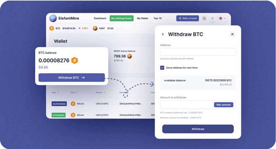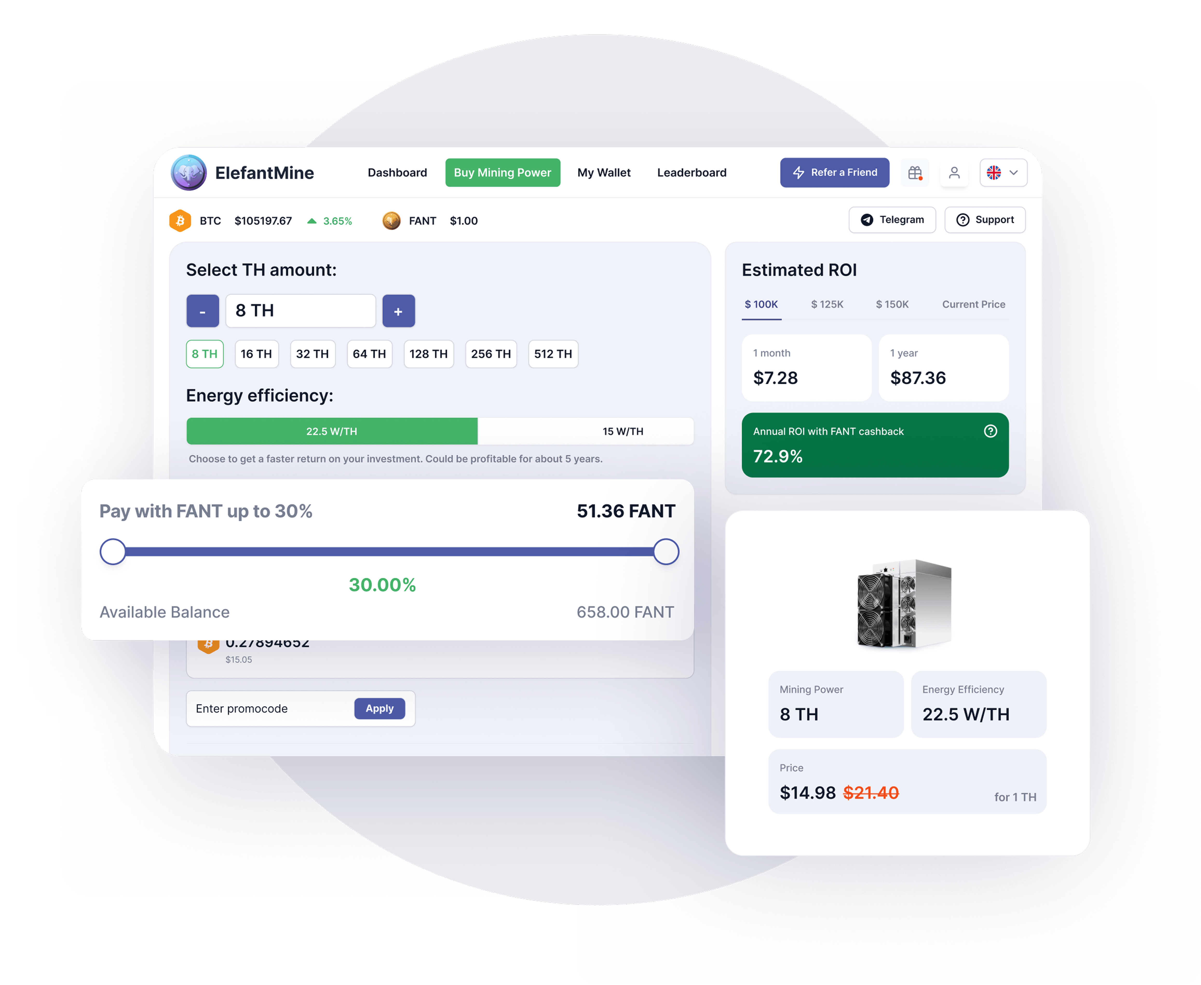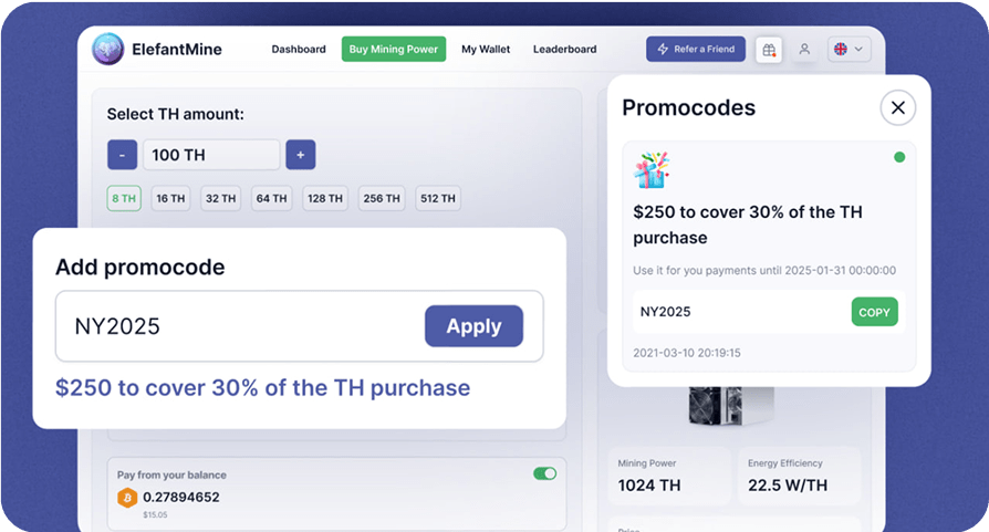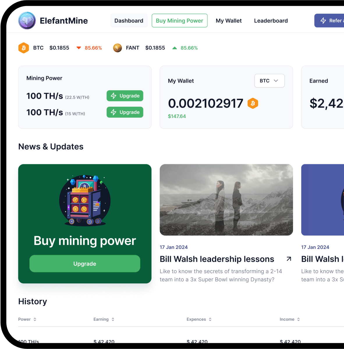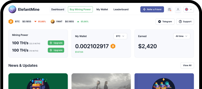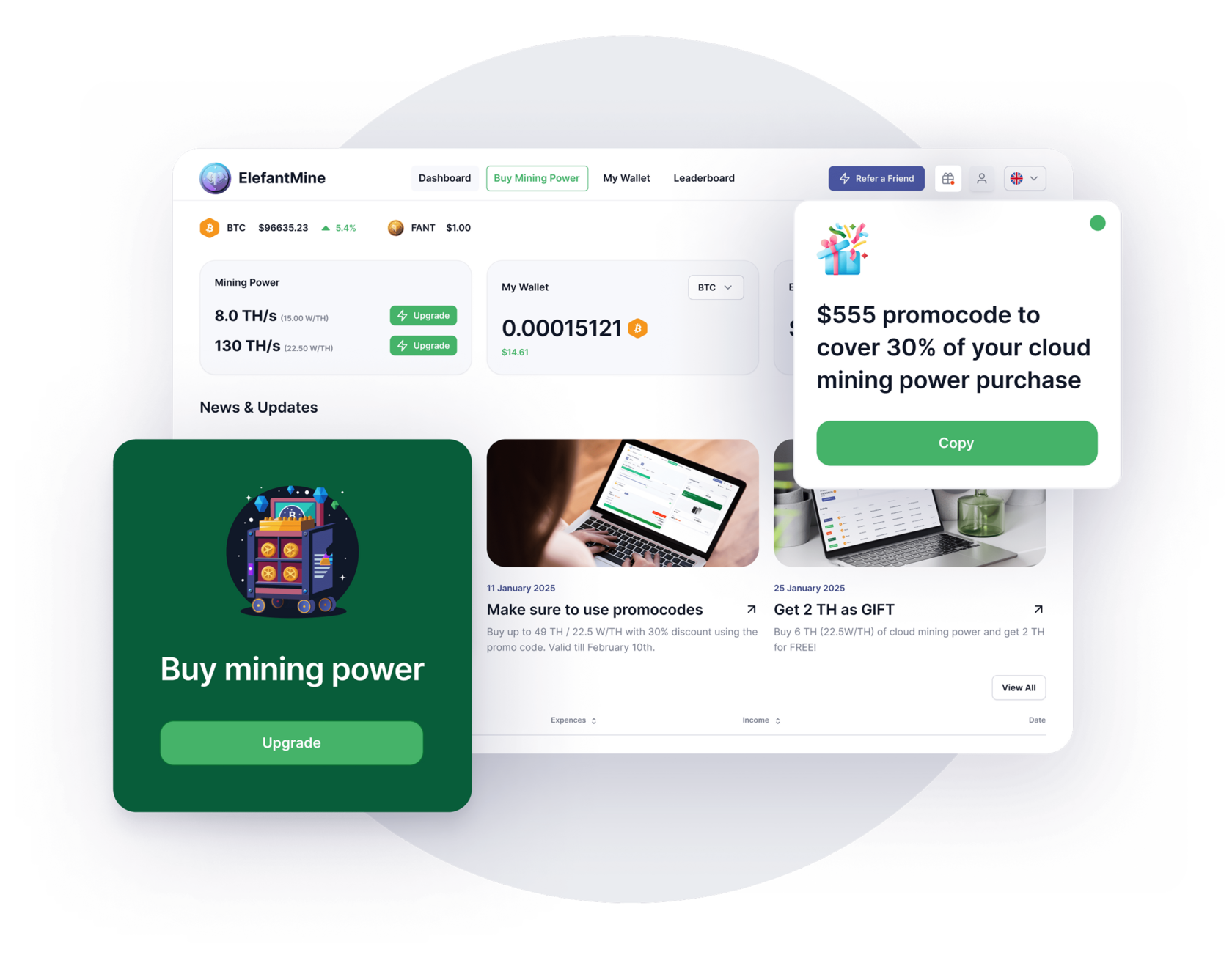ElefantMine is a cloud mining service with 500,000 Th of cloud BTC mining power available for purchase.